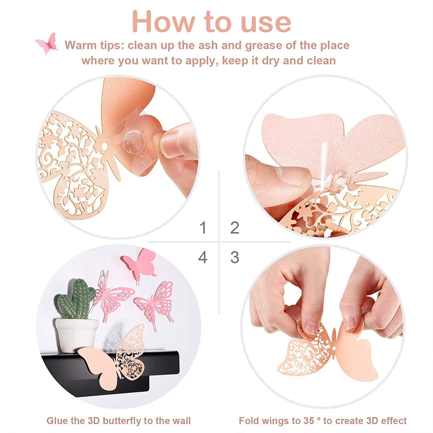 • EASY TO APPLY - These butterfly wall stickers look 2D on the package, but you have to fold the wings slightly to create a 3D effect, just peel and stick, then shape yourself; Please clean the smooth surface before sticking them on.