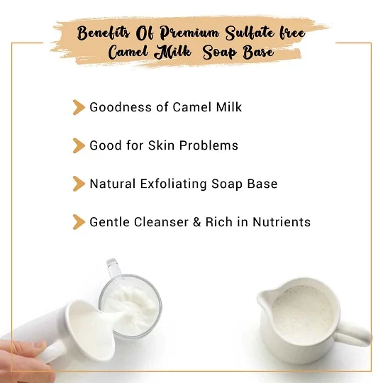 The nutrients present in this soap base make a mild and creamy soap. Our soap base is a rich natural source of Alpha-hydroxy acids and Anti-oxidants which helps in softening the skin. It also effectively diminishes the fine lines and wrinkles. This Sulfate free Camel Milk soap is safe for skin and Overall Health so it is suitable for babies and children too.