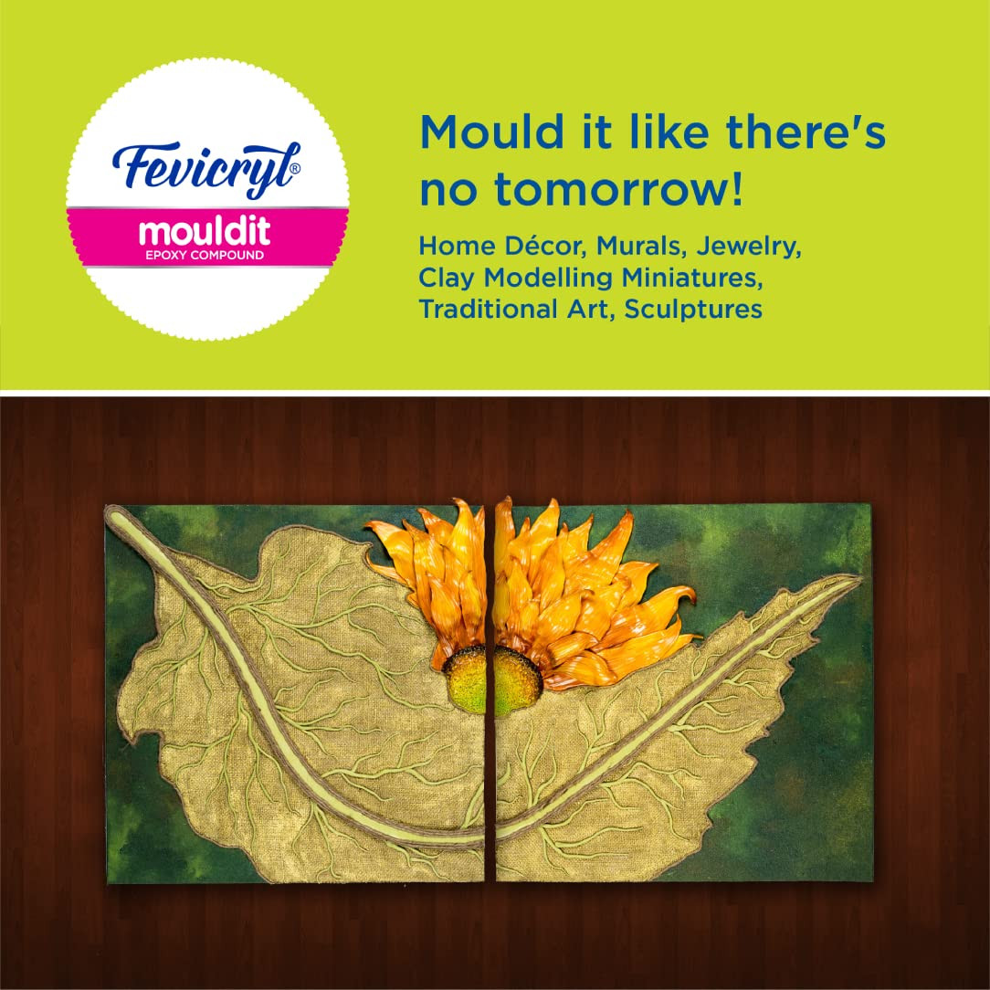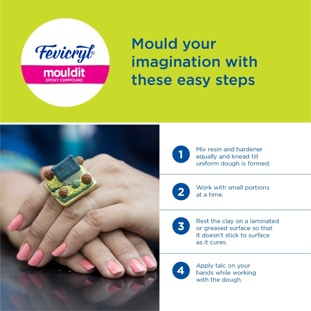 • Fevicryl Mouldit clay is used to mould and create shapes and 3D works of all art like wall hangings, vases, murals, etc. Get the malleability of clay coupled with the binding strength of epoxy resin with Fevicryl Mouldit.