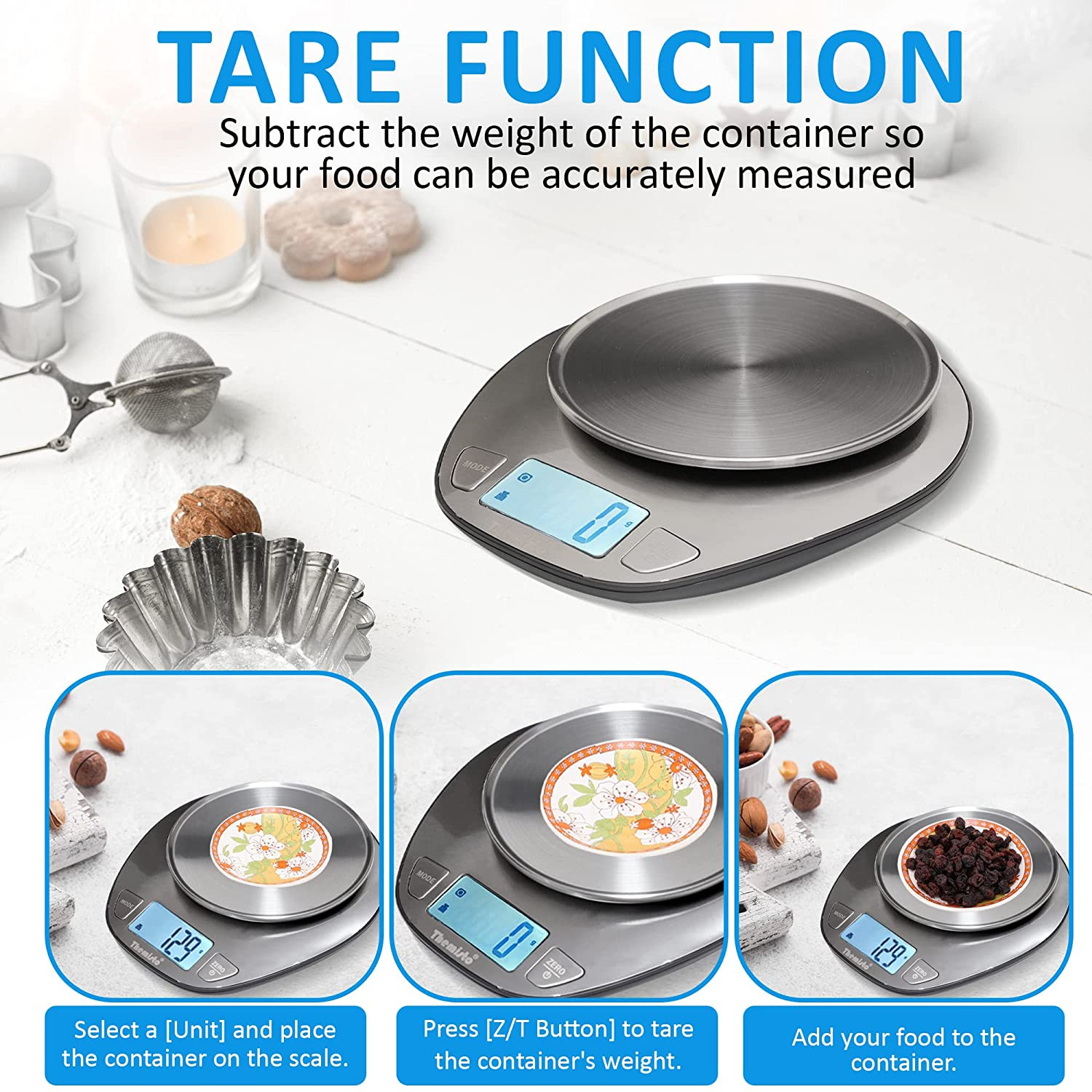 • Easy Tare Function:The taring and auto-zero function of Kitchen Scale allow you to subtract the weight of the bowl, dish, or container from the weight of the food. To ensure food safety, you can use multiple-sized bowls to weigh various types of food separately.